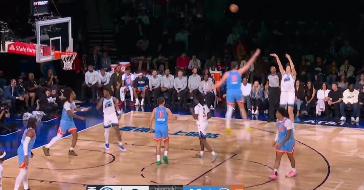 2月14日讯 今日全明星新秀赛小里弗斯队对阵安东尼队。小里弗斯队的杨瀚森一上场就命中了三分。名嘴杨健在直播时谈到了此事。“杨瀚森这个三分很提气,其实可多给杨瀚森机会,克林根可能跟不上他。”杨健表示。GIF-杨瀚森三分