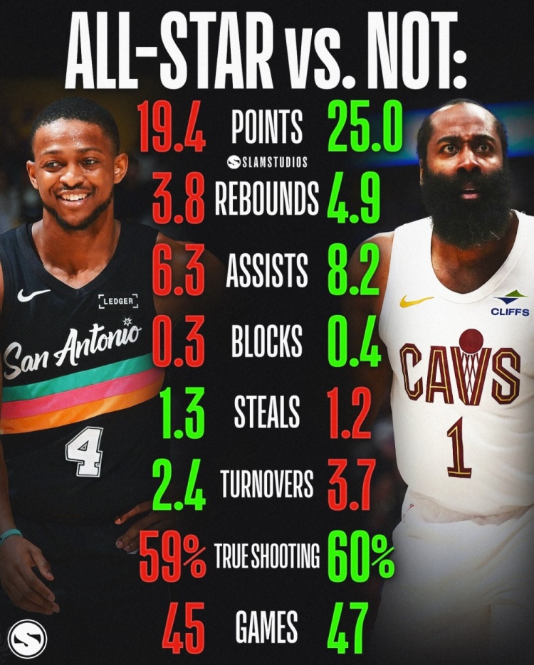 福克斯本赛季场均19.4分3.8篮板6.3助攻0.3盖帽1.3抢断2.4失误,真实命中率59%,出战45场;哈登本赛季场均25分4.9篮板8.2助攻0.4盖帽1.2抢断3.7失误,真实命中率60%,出战47场。美媒Slamstudios晒出上图并写道:“哈登的全明星被抢了?”
