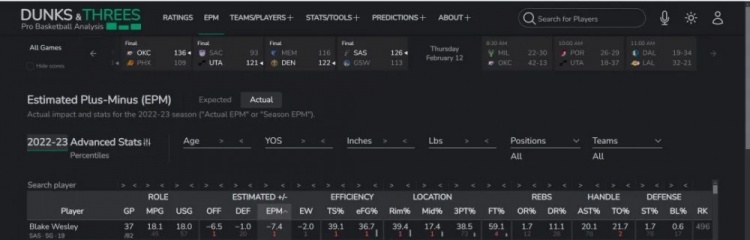 布莱克韦斯利2022-23赛季在马刺打出了-7.4的EPM,数据来源https://dunksandthrees.com/)