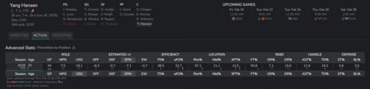 但是小杨如果一直保持这个EPM就不太乐观了,在时间超过500分钟的球员里就只有杨瀚森的开拓者队友前马刺悍将布莱克韦斯利(Blake Wesley)更低了(-7.4)。