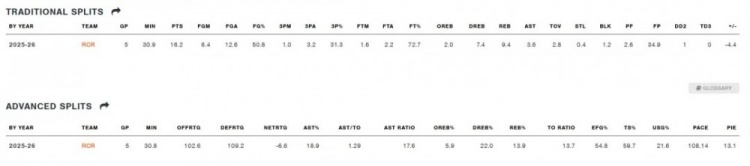 在发展联盟征战的5场比赛里,杨瀚森在场均30分钟可以拿到16.2分9.4篮板(2进攻篮板)以及1.2次封盖。真实命中率是远超NBA常规赛的59.7%。