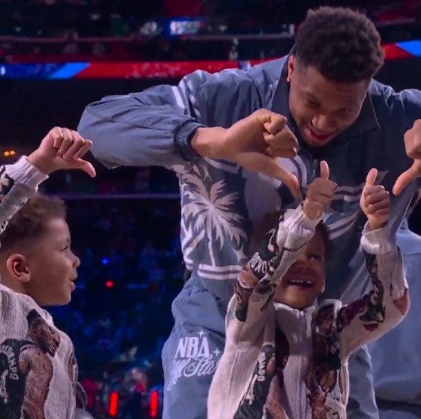 2月16日讯 今日NBA全明星赛,美国星条队48-45战胜世界队。比赛中,伦纳德化身战神卡,字母哥的儿子在场边竖起大拇指为伦纳德加油,作为世界队的一员,字母哥赶紧按下儿子的双手,并教他拇指向下嘘。GIF-字母哥教儿子拇指向下值得一提的是,字母哥曾在与雄鹿主场球迷对嘘时使用此手势。