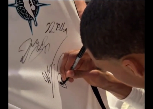 约基奇幽默要求文班亚马在自己的球衣上签名并画一个外星人,文班照做。