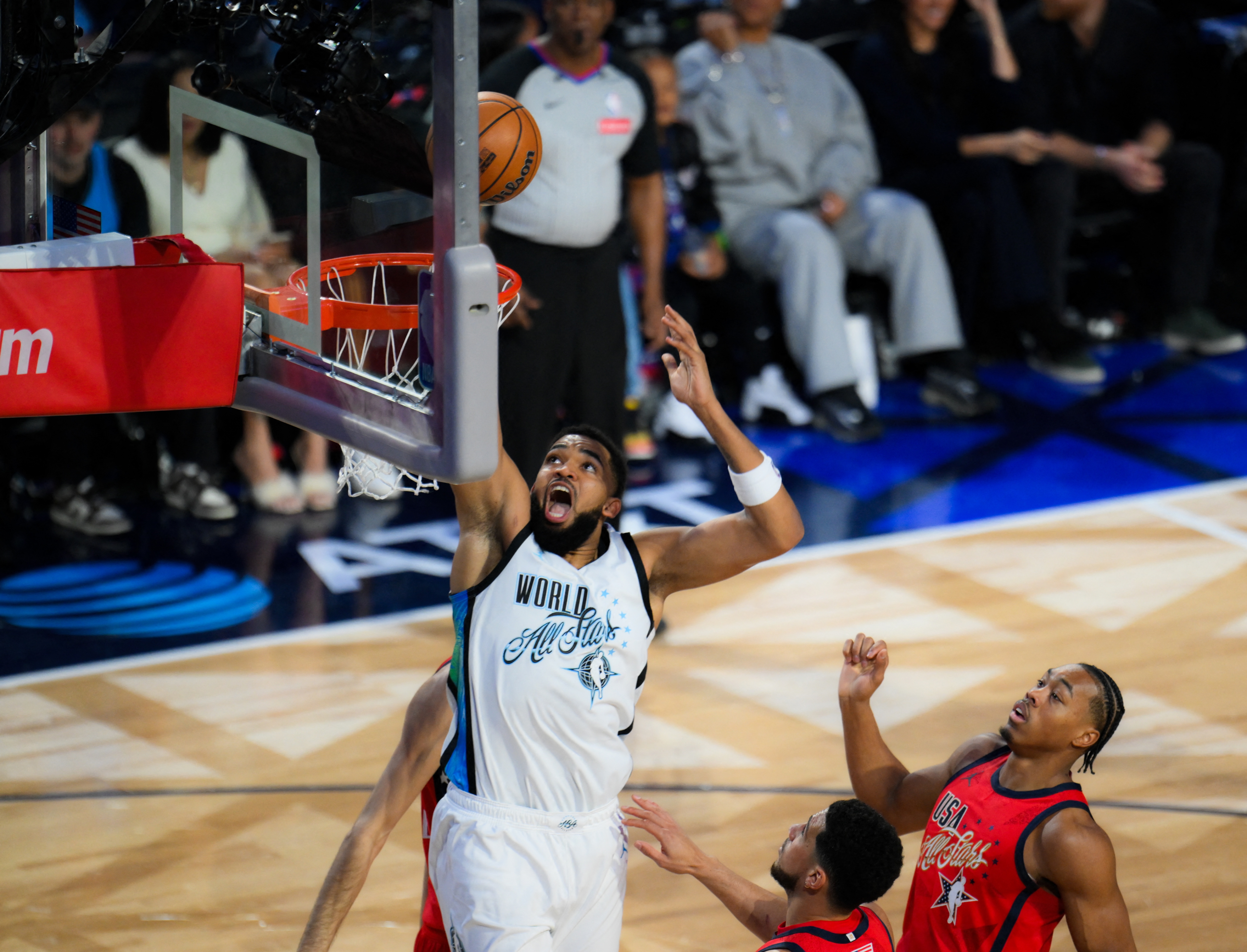 2月16日讯 今日,全明星世界队成员、尼克斯球星卡尔-安东尼·唐斯出席了新闻发布会。