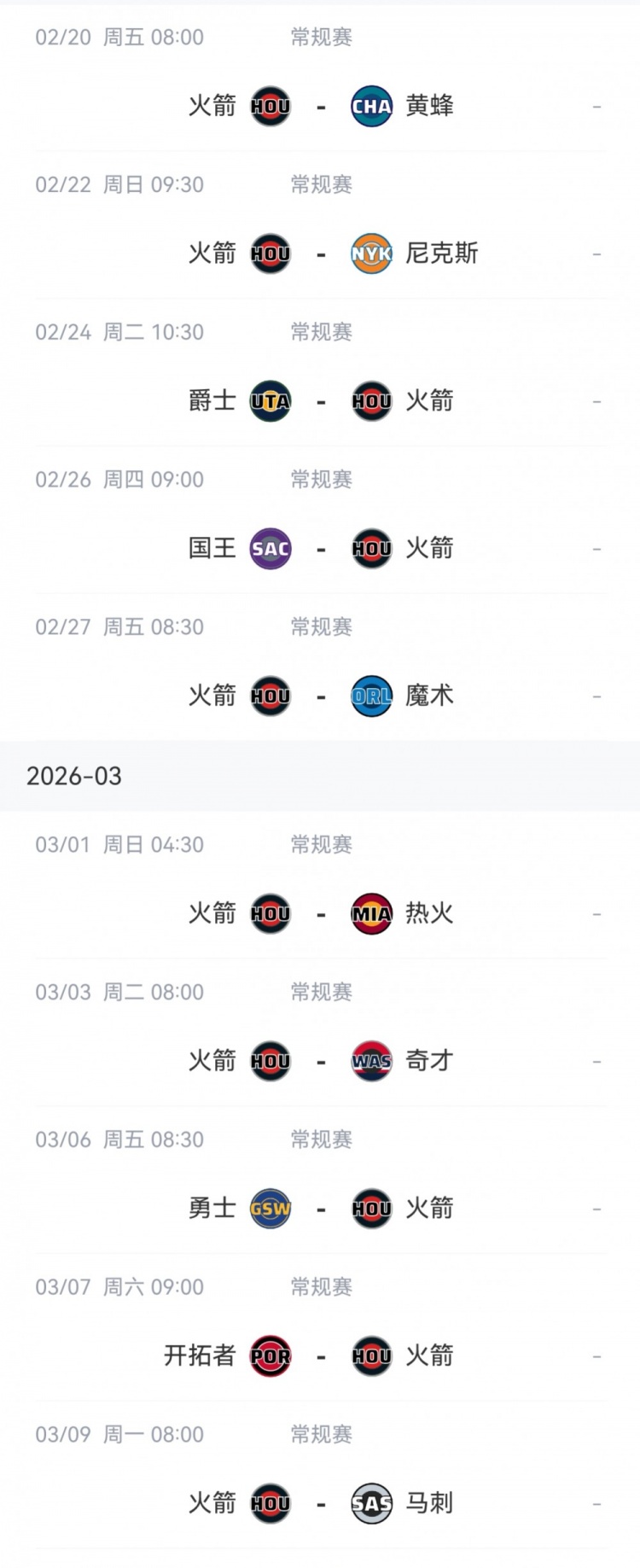 2月18日讯 火箭媒体人Bradeaux晒出了火箭全明星后的10场赛程,其中仅尼克斯、魔术、热火、勇士、马刺胜率在50%或以上,具体如下: