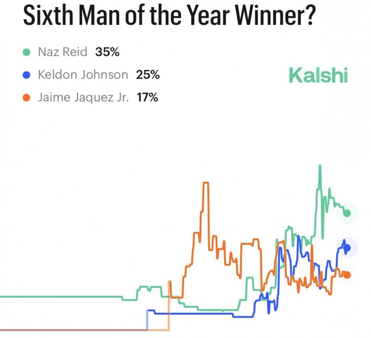 2月18日讯 今天,体育预测平台KalshiSports本赛季最佳第六人的获选概率,森林狼球员纳兹·里德排名第一。