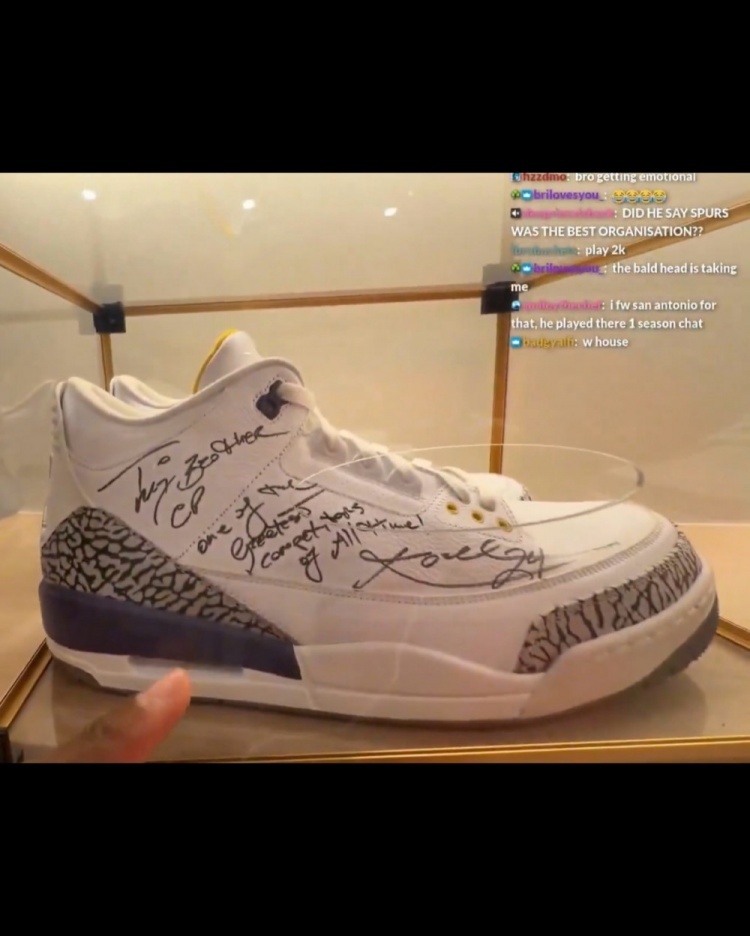 2月19日讯 保罗在网红Tylil James的直播中展示了他和科比最后一次交手时,科比给他的签名。保罗给Tylil展示了一双他在2016年与科比最后一次交手后,让科比签名的湖人配色Air Jordan 3 PE,这个配色也是科比早年乱穿鞋赛季穿过的一款PE配色。科比在球鞋上写道:“送给我的兄弟CP,史上最伟大的竞争者之一!(To my brother CP, one of the greatest competitors of all time)”