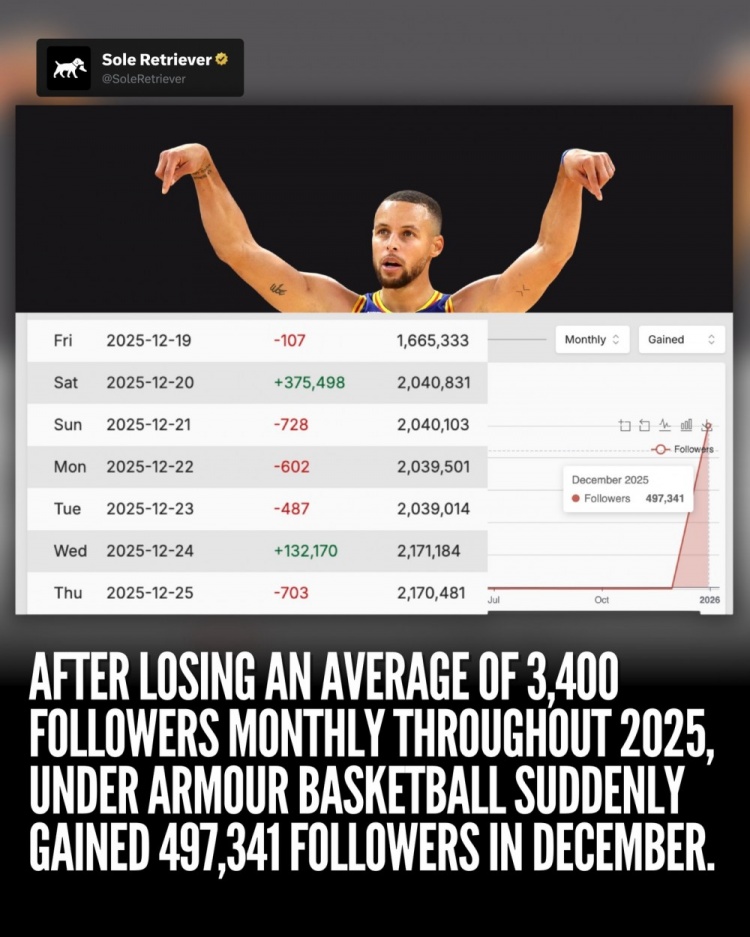 Sole Retriever还晒出了UA Basketball在去年12月底粉丝涨跌情况的截图,其中有两天合计涨了超过50万粉丝,而相近的几天粉丝都是负增长。而原本有50万粉丝的Curry Brand账号粉丝则只剩下了几百个粉丝(目前在3000左右)。