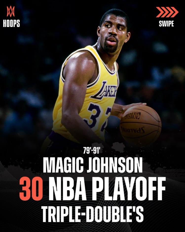 季后赛三双数TOP10!魔术师30次第1 老詹28次第2 约老师21次第3
