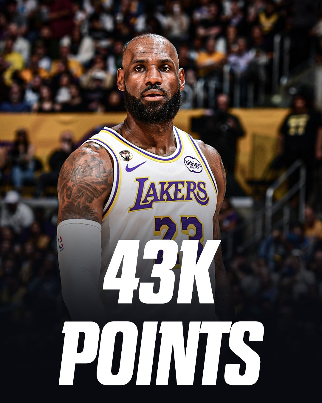 02月23日讯 NBA常规赛,湖人在主场以89-111惨败凯尔特人。本场比赛,詹姆斯得到20分4篮板5助攻2抢断1盖帽,NBA生涯常规赛总得分突破43000(43008分)大关,成为史上首位43000分先生。
