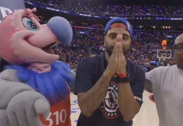 2月23日讯 NBA常规赛,快船主场迎战魔术。比赛间歇时快船主场举行球迷互动活动,一名身穿快船球衣的球迷中圈投篮命中,赢得1万美元!值得一提的是,今天已经有两名球迷都投中了价值1万美元的中圈投篮。GIF-快船球迷一投1万刀相关新闻:太阳球迷投进中场超远三分 喜提10000美金
