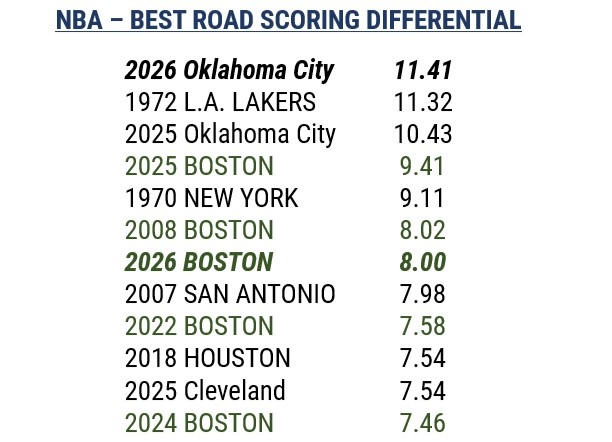 据统计,此役过后,凯尔特人本赛季客场场均净胜分来到8分,为历史第7高。