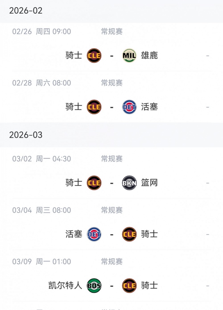 骑士接下来5场比赛赛程如下: