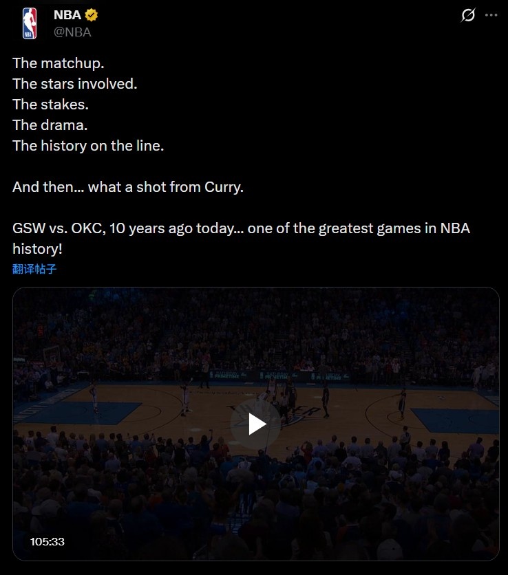 而今日,NBA官方晒出这场比赛的全场回放,回顾了这场库里的经典战役,配文道:对决的双方、球星的对决、悬而未决的结果、扣人心弦的戏剧性、历史性的时刻,然后……库里投出了那记不可思议的球。10年前的今天,勇士对阵雷霆……这是NBA历史上最伟大的比赛之一!