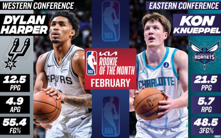 月最佳新秀:哈珀场均12.5分4.9助 克尼佩尔三分命中率48.5%