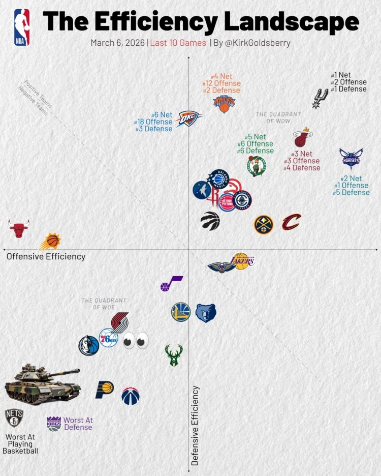3月6日讯 今天,美媒Kirk Goldsberry晒图统计了NBA过去10场比赛所有球队的攻防效率,详情入下: