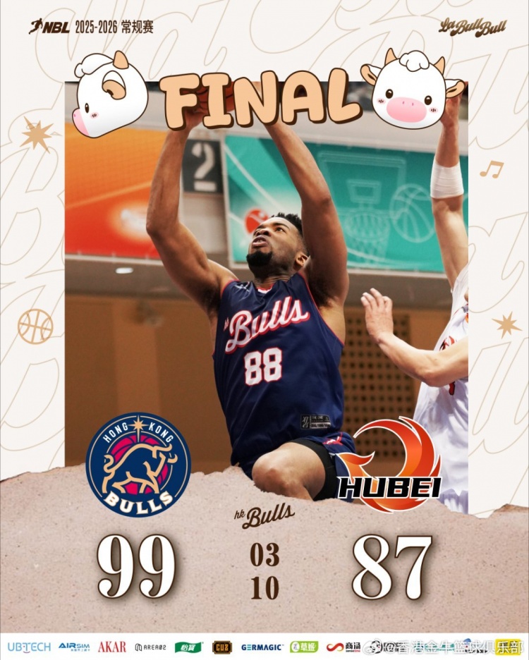 末节比赛,卢艺文突破分球助攻侯天一篮下轻松打进,唐才育与厄特尔相继投进三分,阿诺斯克完成双手暴扣并打成2+1,此后球队稳扎稳打掌控局势。全场比赛结束,香港金牛99-87战胜湖北文旅。