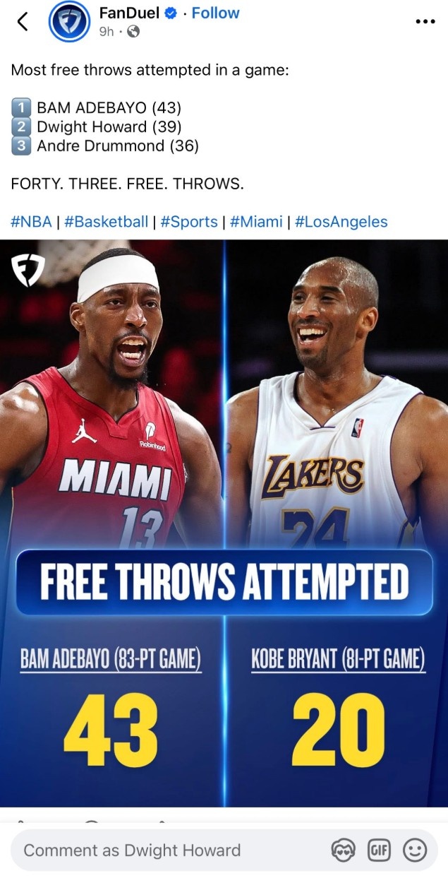 3月12日讯 热火150-129主场击败奇才,阿德巴约独得83分超越科比的81分,创NBA历史第二单场个人高分,仅次于张伯伦的100分。此役。阿德巴约43罚36中,打破了历史单场罚球出手次数(霍华德、39)和罚球命中次数(丹特利、28)纪录。德怀特·霍华德今天转发评论道:“哈哈,我39中18,兄弟是43中36,这令人印象深刻。”值得一提的是,霍华德生涯有两次单场罚球39次,分别是39中21和39中25。