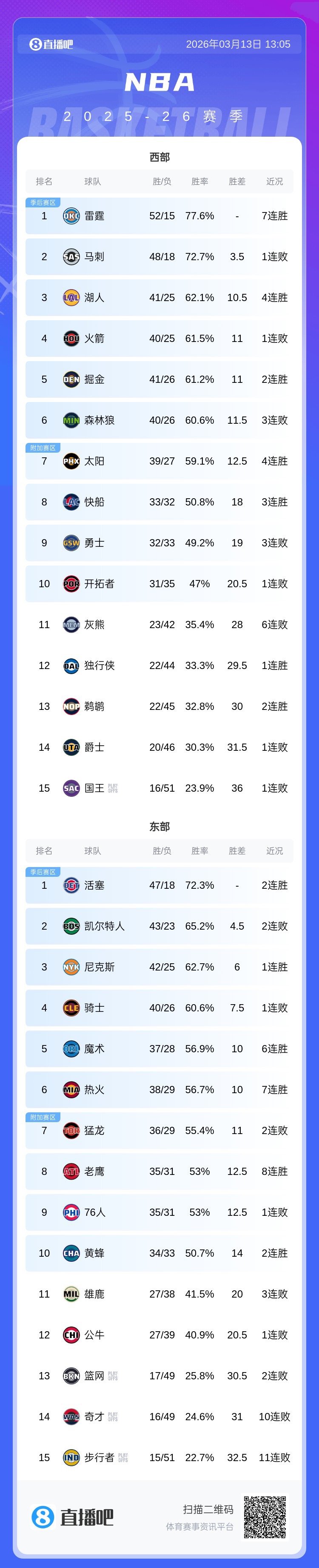 湖人的战绩来到41胜25负,超越火箭(40胜25负)升至西部第三。