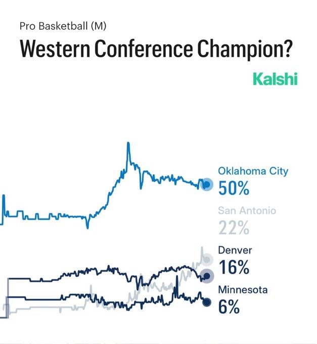 3月14日讯 预测平台Kalshi Sports更新了本赛季西部冠军概率,具体如下: