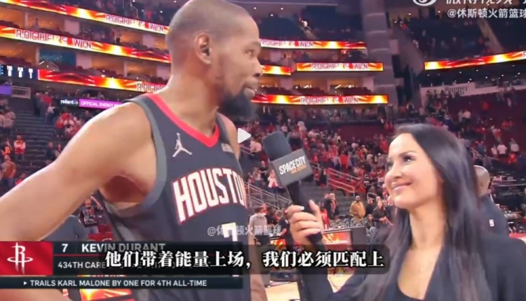 3月14日讯 NBA常规赛,火箭107-105击败鹈鹕。赛后杜兰特接受记者瓦妮莎的场边采访。