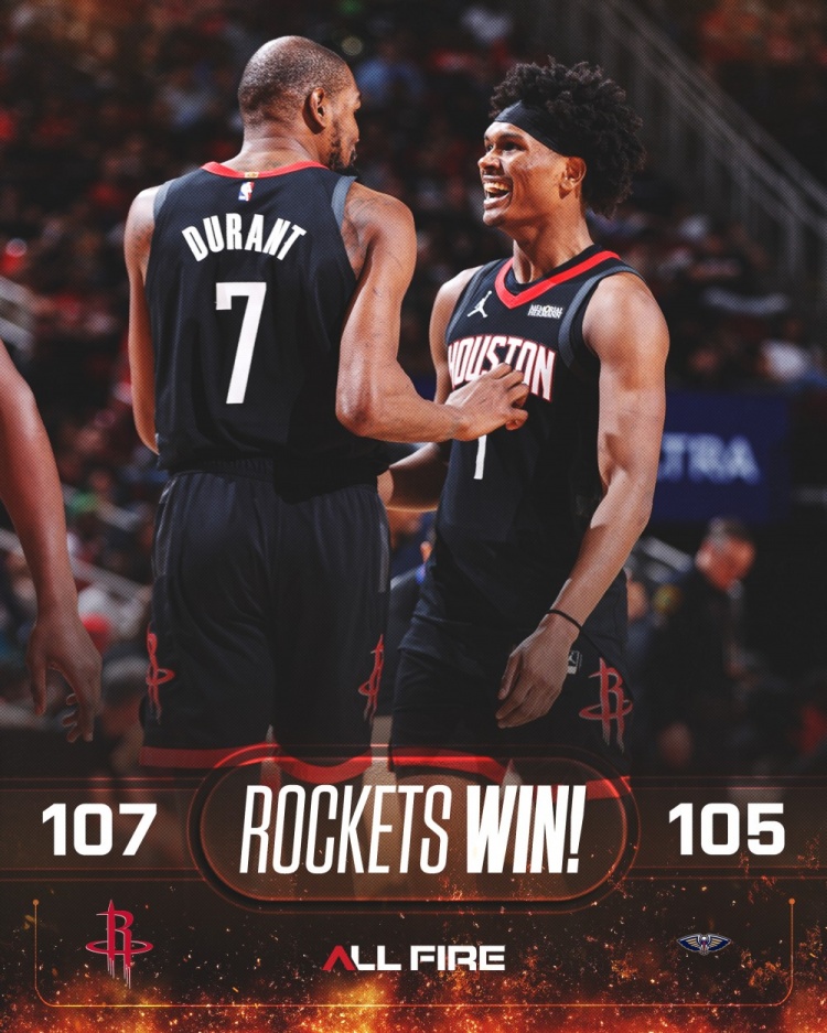 3月14日讯 NBA常规赛,火箭107-105击败鹈鹕。赛后火箭官方发布赢球海报,杜兰特和阿门·汤普森成为封面人物。本场比赛杜兰特出战40分钟,投篮24中13,三分球7中3,罚球4中3,砍下32分6篮板5助攻1抢断1盖帽;阿门也出战40分钟15投7中(三分3中2)、罚球8中7,砍下23分12篮板(6个前板)8助攻1抢断。