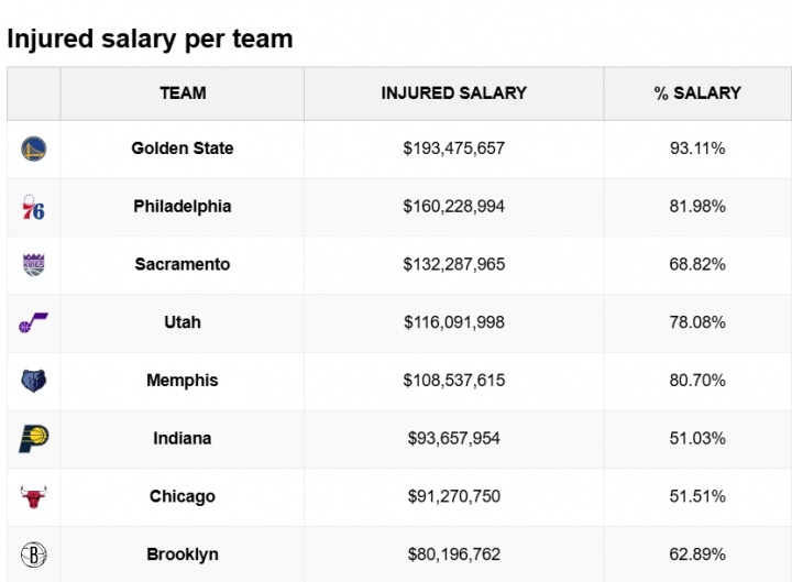 03月15日讯 明早八点,勇士将对阵尼克斯,追梦、波津、梅尔顿、霍福德确定缺席;昨日对森林狼的比赛中,勇士赛中伤退三人,加上已经缺席许久的库里、巴特勒、穆迪等人,勇士目前的伤员薪水已经达到了1.93亿美元,占全队工资的93.11%,两个数字都是高居联盟第一;在伤员薪水绝对值和占比上排名第二的都是76人,他们伤员工资1.6亿美元&占全队薪水81.98%;绝对值第三是国王,占比第三则是灰熊。