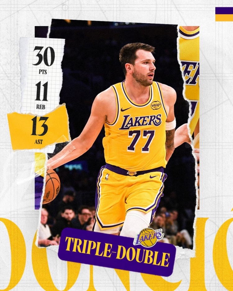 赛后,湖人官方晒出东契奇的数据海报,配文写道:“三双,外加绝杀!东契奇,今晚属于你!