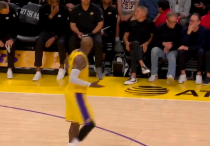 麦克风捕捉到詹姆斯对着教练组大喊:“知道八村现在几个犯规了吗?没人知道吗?我只是想确认下他别陷入犯规麻烦。有必要的话,我来防约基奇。”最后,詹姆斯抬头 试图从大屏幕得知八村塁的犯规次数。GIF-詹姆斯与教练组沟通