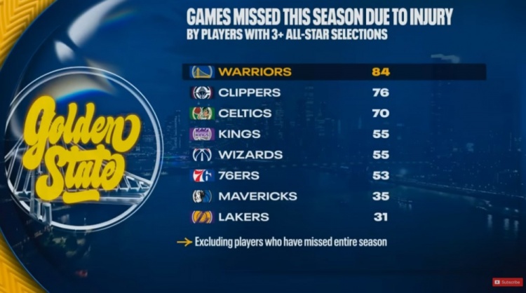 本赛季至少入选3次全明星球员因伤缺阵场次:勇士84场全联盟最多