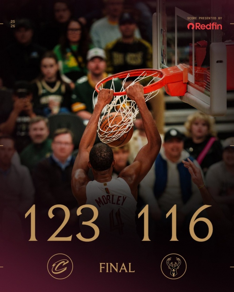 3月18日讯 NBA常规赛,骑士客场123-116击败雄鹿。赛后球队官方发布赢球海报,莫布里扣篮瞬间成为封面。本场比赛莫布里表现出色,进攻端得吃得喝篮板也抢得很凶,有6个前场篮板,首发出战33分钟,投篮21中12,三分球2中0,罚球5中3,砍下27分15篮板2助攻3盖帽的数据,正负值+7。