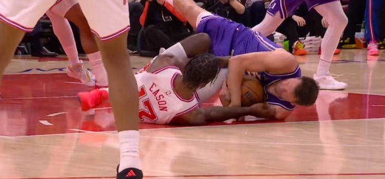 拼抢激烈!东契奇与伊森倒地争球都不肯撒手 一片混战