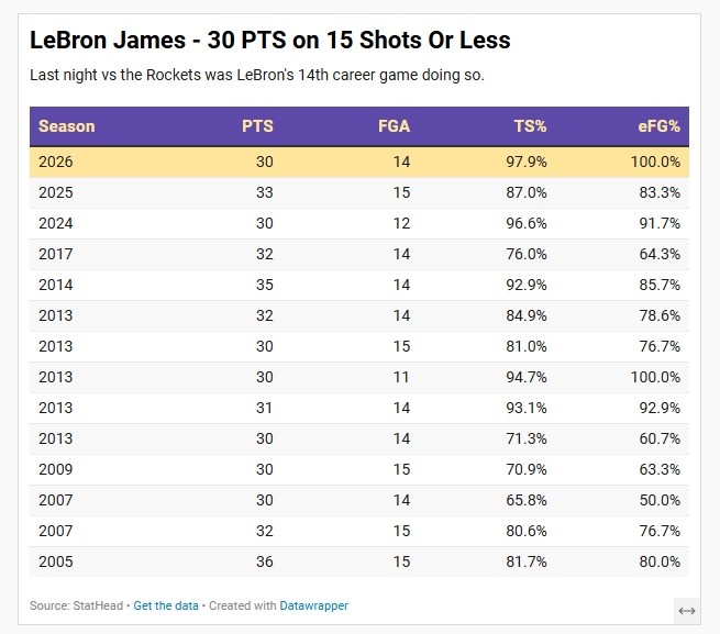 据统计,这是詹姆斯生涯第14场比赛在不超过15次出手得到30+分。
