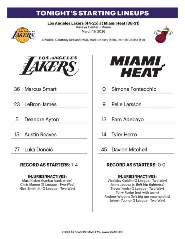 3月20日讯 今日NBA常规赛,湖人背靠背挑战热火,赛前双方公布了本场比赛首发阵容。