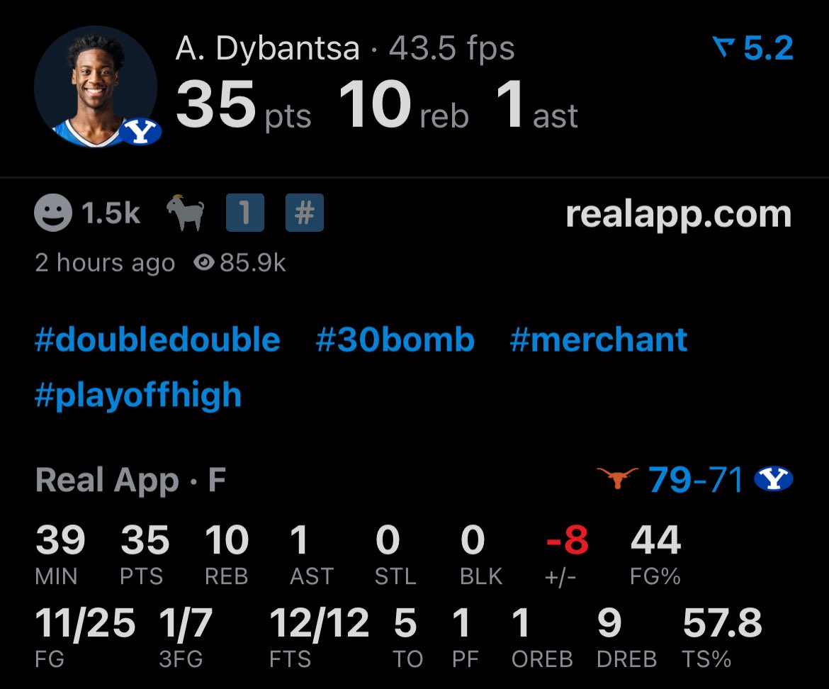 迪班萨出战39分钟,投篮24中11,三分6中1,罚球12中12,空砍35分10篮板1助攻,还有5个失误。