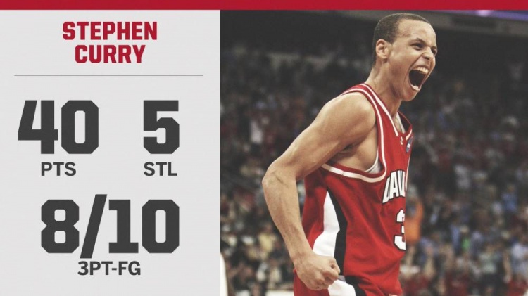 本场比赛,当时效力于戴维森学院的库里出战39分钟,22投14中,三分球10中8、罚球6中4,砍下40分3篮板2助攻5抢断,其中下半场则是贡献30分。