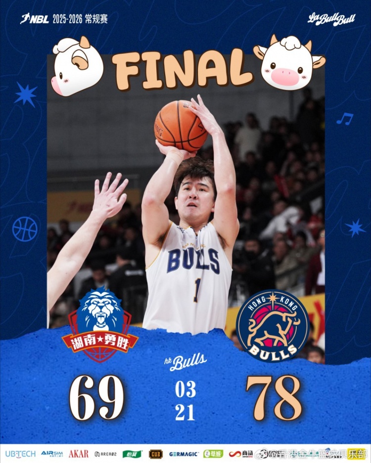 末节决战,阿诺斯克、庞兹先后命中中距离投篮,琼斯凭借个人节奏,顶着三人防守强硬打成2+1。在对手追分的关键时刻,董建连续命中两记三分,帮助球队锁定胜局。全场比赛结束,香港金牛78-69战胜长沙勇胜。