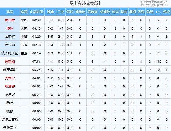勇士首节就进行9人轮换,球队在后半节逐渐找到状态,出场球员全部都有得分,其中波斯特得分最高拿到8分,替补登场的威廉姆斯拿到7分,格林拿到5分。