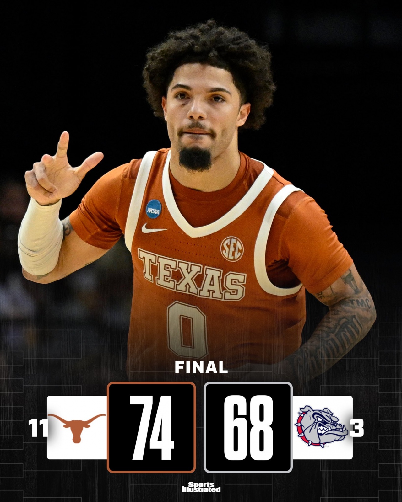 03月22日讯 NCAA疯三首轮,西区三号种子冈萨加大学68-74惨遭得11号种子得克萨斯大学(杜兰特母校)下克上。