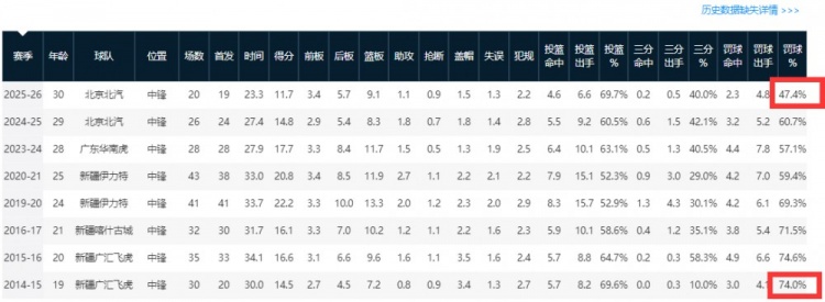 3月23日讯 CBA常规赛,北京以86-88不敌吉林。此役,北京男篮顶薪中锋周琦出场28分23秒10投8中,但是罚球8中0,得到16分6篮板4盖帽。据统计,周琦本赛季罚球命中率只有47.4%。而在生涯首个赛季,周琦罚球命中率还有74.0%。前三个赛季,周琦的罚球命中率都在七成以上!