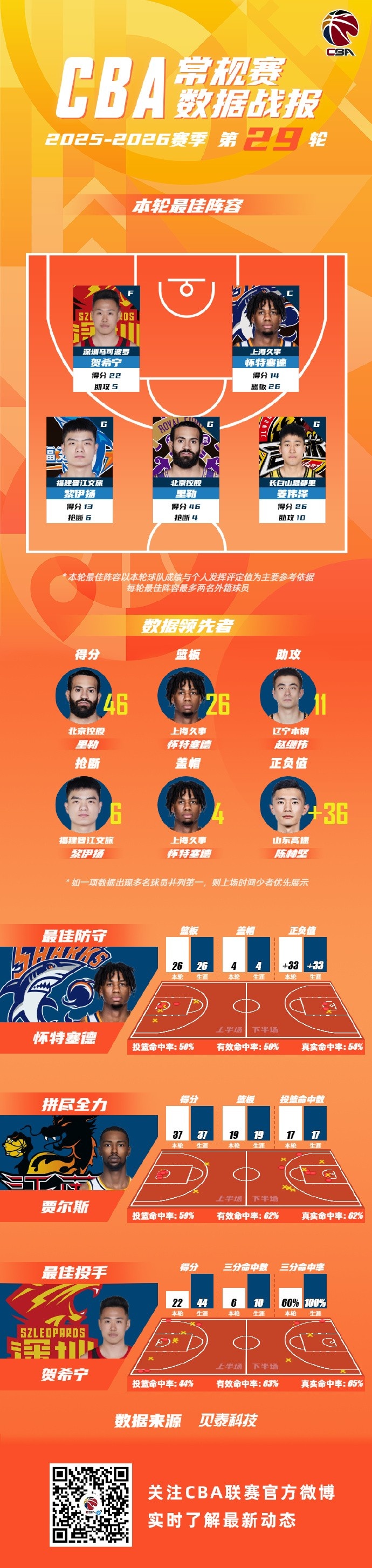 2025-2026赛季CBA联赛常规赛第29轮结束较量,来自深圳新世纪烈豹篮球俱乐部的贺希宁,上海久事大鲨鱼的怀特塞德,福建浔兴SBS男篮的黎伊扬 ,北京控股篮球俱乐部的里勒和吉林东北虎男篮的姜伟泽入选CBA联赛常规赛第29轮最佳阵容!
