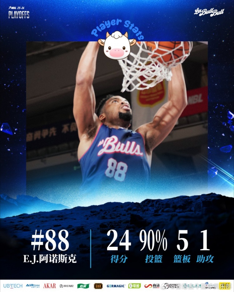 香港金牛季后赛首战告捷,全队多点开花,三外援表现抢眼。阿诺斯克接连送上精彩暴扣,全场以高达90%的投篮命中率砍下24分5篮板1助攻;庞兹屡送精妙助攻,进攻方式华丽多变,贡献11分6篮板5助攻1抢断;琼斯则拿下13分10篮板7助攻4抢断的两双数据。