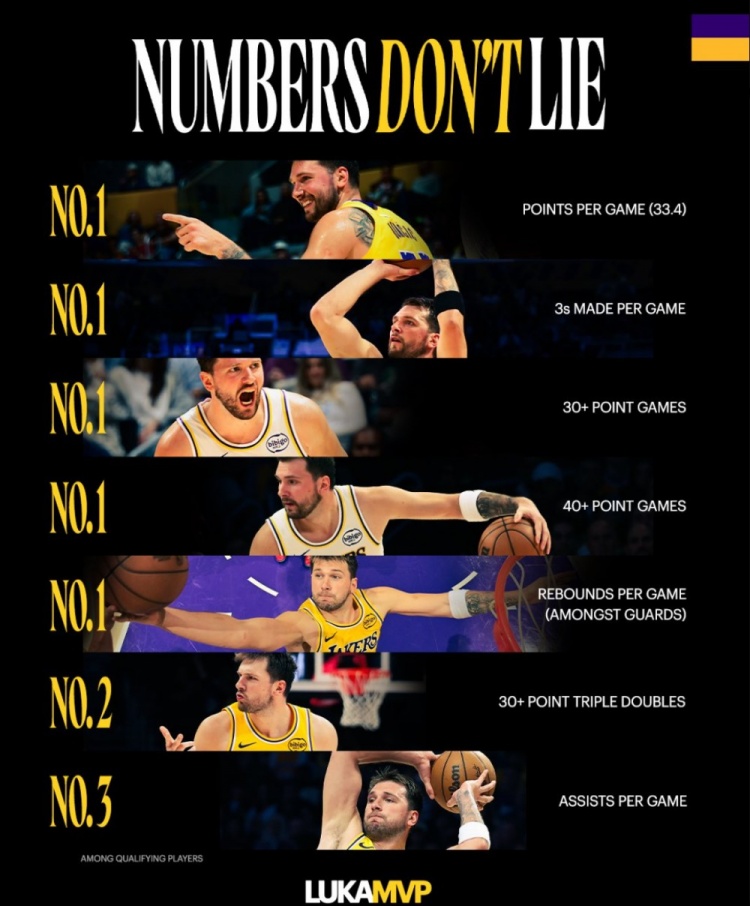 3月25日讯 今天,湖人官方晒出了东契奇的几项数据记录,并写道:“数据不会说谎。”详情如下:场均33.4分联盟第一场均三分球命中数(4记)联盟第一单场30+场次(41次)联盟第一单场40+场次(13次)联盟第一场均篮板数(7.9板)后卫中第一30+三双(7次)联盟第二多,仅次于约基奇场均助攻8.4次联盟第三多
