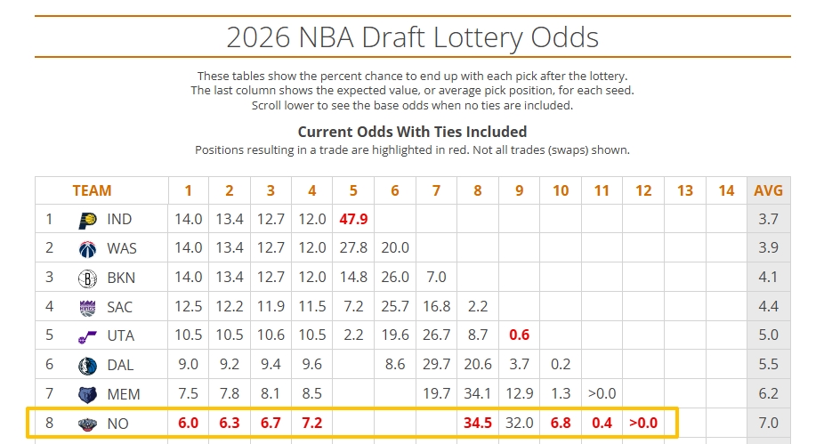 无缘季后赛和附加赛,使得鹈鹕今年首轮签必然是乐透签,目前看抽到第8顺位的概率最大,还有6%的概率拿到状元签。鹈鹕(25胜48负)目前落后雄鹿(29胜42负)5个胜场,他们今年的首轮签大概率要给到老鹰。