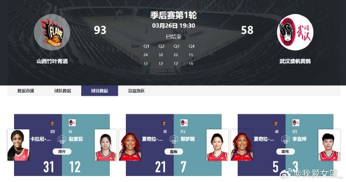 在刚刚结束的一场WCBA季后赛中,山西竹叶青酒主场93-58轻取武汉盛帆黄鹤,取得开门红。