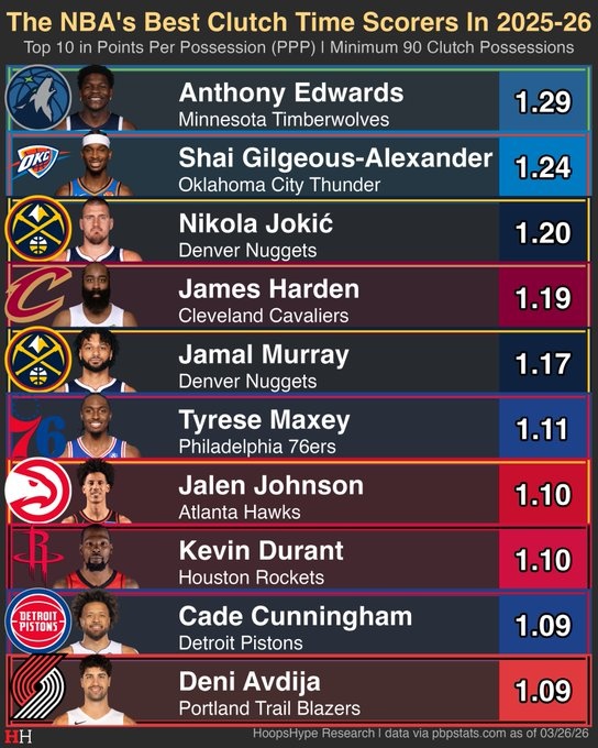 1、爱德华兹 1.29分2、亚历山大 1.24分3、约基奇 1.20分4、哈登 1.19分5、贾马尔·穆雷 1.17分6、马克西 1.11分7、杰伦·约翰逊 1.10分8、杜兰特 1.10分9、坎宁安 1.09分10、阿夫迪亚 1.09分