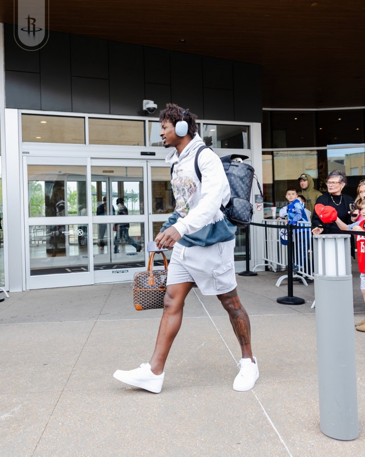 火箭众将今日OOTD:申京宽松灰色套装 杜兰特黑帽如常 伊森红蓝配