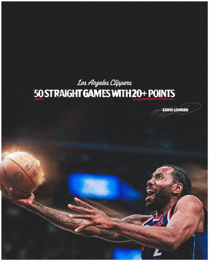 NBA常规赛,快船客场挑战步行者。比赛第末节,快船当家球星科怀·伦纳德中距离干拔命中砍下本场第21分!此球命中后,伦纳德成为NBA历史第14位连续50场砍下20+的球员,同时也是同时也是首位在30岁后达成此成就的球员。