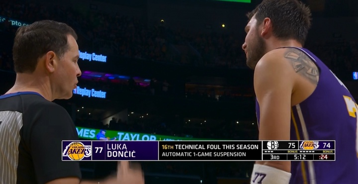 3月28日讯 湖人vs篮网比赛第三节,东契奇与扎威吃到技术犯规。由于这是东契奇本赛季常规赛的第16个技犯,按照规则,他下一场将被停薪禁赛!根据此前的计算,东契奇的这个技犯将导致他损失大约27万美元。GIF-东契奇跟扎威爆发推搡冲突,裁判吹了双方技犯!
