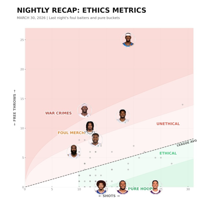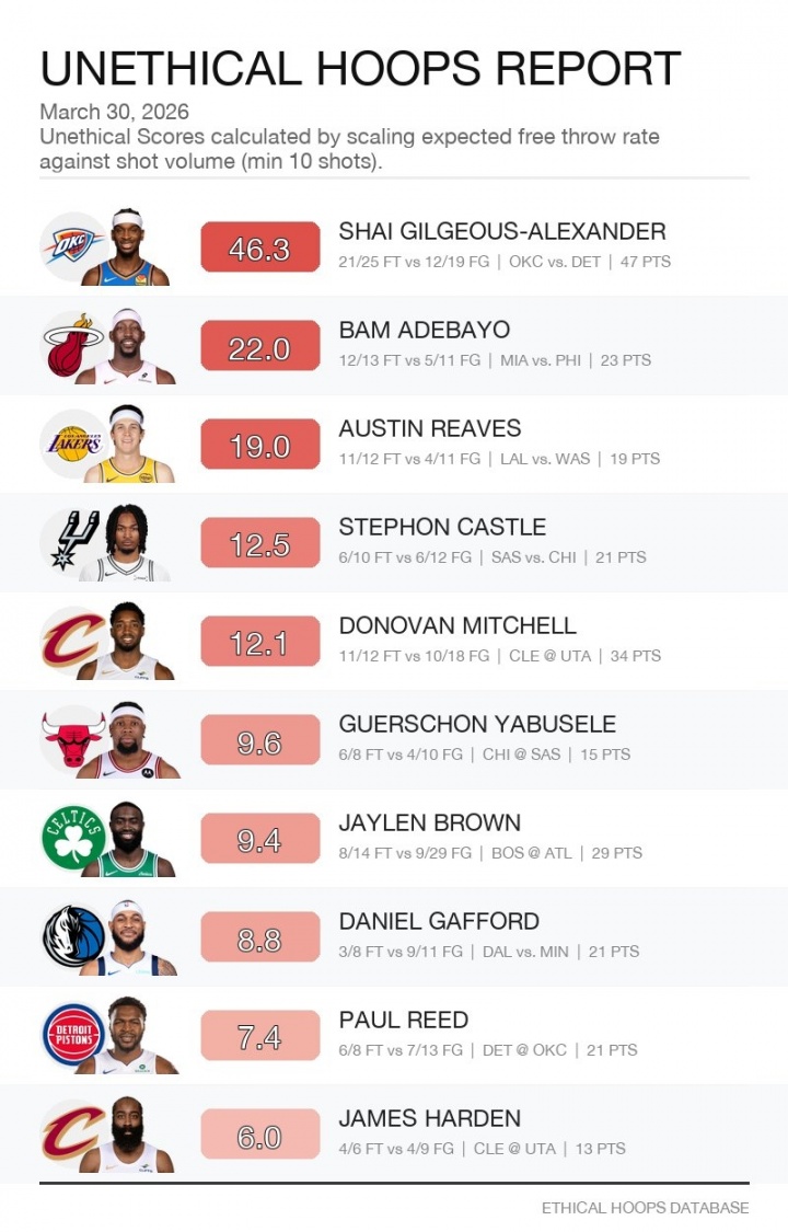 04月01日讯 自媒体Unethical Hoops统计了昨日的“无道德篮球(Unethical)”相关数据,他得出的结论显示,SGA在“无德”方面遥遥领先,阿德巴约第二,里夫斯第三;Unethical Hoops的“无德”指数主要依靠罚球数量vs出手数的比值来进行计算,数值越大,越是“没有道德”;Unethical Hoops也统计了反向数据,结果显示,布克、杰伦·格林、丹尼斯·詹金斯这三人打的是“最纯粹”的篮球。
